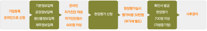 신청 중소기업이 직접 ‘경영혁신형 중소기업 평가지표’에 따라 온라인 자가진단을 실시. 자가진단 결과 600점 이상(1,000점 만점)인 중소기업을 현장평가대상으로 선정 중소기업 경영혁신 능력 평가